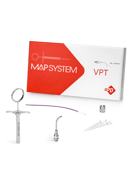 MAP VPT è un’estensione della gamma MAP SYSTEM progettato specificamente per la Terapia della Polpa Vitale, come l’incappucciamento della polpa dentinale, ed è particolarmente adatto non solo per i pedodontisti e gli endodontisti, ma anche per i dentisti generici. Permette un posizionamento rapido e preciso dei biomateriali per una procedura riproducibile.