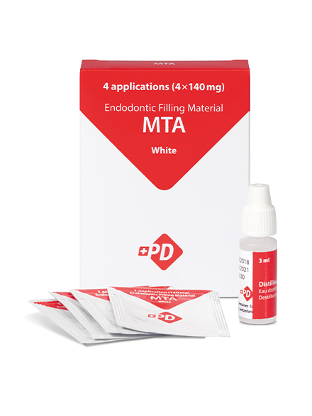 L’eccellente biocompatibilità di PD™ MTA White con la parete dentinale e la polpa ne consente l’uso per otturazioni radicolari ortograde e retrograde, per il trattamento dei riassorbimenti radicolari cervicali, come materiale di incappucciamento della polpa, nonché per l’apecificazione e la pulpotomia dei denti immaturi nei bambini e negli adolescenti.